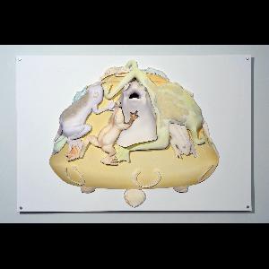 Extended Label Info: This image is a digitally-produced paper copy of a ceramic teapot with frogs on it, rendered from an image of an early 20th century Japanese Banko Ware teapot in the collection of Art Gallery of Greater Victoria (AGGV). The artist Susan Shantz, began this process by selecting images from an online archive. Then she used three-dimensional modeling software and a robotic “haptic” tool to simulate the process of sculpting clay, and recreated this teapot digitally, in both a three-dimensional paper image (pictured here) and as three-dimensional plastic object produced by a 3D printer. This artwork and the 3D printed teapot were displayed in the exhibition at Dunlop Art Gallery entitled, Creatures in Translation (2012). Susan Shantz is very interested in the way aspects of a culture are interpreted and replicated over time. The original version of this teapot was produced by the Banko factory, which used mould methods and skilled artisans to make copies of earlier hand-made teapots by Master Banko artists, who were initially inspired by historical Chinese works in red and green porcelain from the Ming dynasty. By using contemporary technologies, Shantz adds another layer of interpretation to the history and reproduction of this teapot. Susan Shantz (1957- ) is an artist and Professor in Sculpture and Extended Media at the University of Saskatchewan, Saskatoon. Born in Ontario, she earned her BA at Goshen College, Indiana, USA; MA in Religion and Culture from Wilfrid Laurier University, Waterloo, Ontario; and MFA degree in Sculpture and Interdisciplinary Studies from York University in Toronto. Though Shantz often produces object-based materials, her work is more concerned with the exploration of process, materials, and ideas than formal structures. Shantz has worked with a variety of sculptural media, including twigs, ash, found objects, tomato paste, and 3D printed thermoplastic prints. Her work is in held in national public collections.