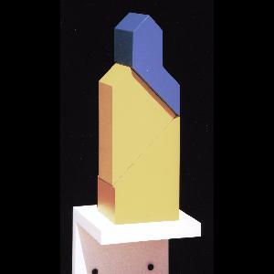 Extended Label Info: These ten brightly coloured geometric shapes are variations on the silhouette of the grain elevator. Their simplified forms reflect the influence of Constructivism and Structurism on the Kostyniuk’s style of working. These early twentieth century art movements sought to understand how meaning is conveyed by breaking down visual information into symbolic elements. The grain elevator has an iconic shape, and was once part of every town in southern Saskatchewan. These unusual wooden structures stored grain before it shipped by rail to market. Up to 100 feet tall, the elevators became known as “Prairie Giants” or “Sentinels”. The railway, the post-office and the grain elevator were at the economic heart of prairie agriculture in the twentieth century. Particularly in the early settler days before telephones became widespread, the elevator site was a social hub for farmers bringing grain to sell, and buying new supplies. Today, elevators, small farms and small towns are slowly disappearing. Agriculture is more mechanized, and grain is shipped via truck to huge inland terminals. Ronald Kostyniuk (1941 - ) was born in Wakaw, Saskatchewan. Kostyniuk earned a BA in Biology and a BEd from the University of Saskatchewan, Saskatoon (1963); a BFA from the University of Alberta, Edmonton (1969); an MSc (1970) and an MFA (1971) from the University of Wisconsin, Madison, WI, USA. In Saskatoon, Kostyniuk became inspired by the writings of the American artist Charles Biederman, whose analytical approach to art struck a chord with Kostyniuk's scientific background and inspired him to develop art based on the patterns in nature. He is retired from the University of Calgary and lives in Calgary. He has exhibited internationally and his work is represented in numerous collections including the Institute of Modern Art (Chicago), Canada Council Art Bank (Ottawa), MacKenzie Art Gallery (Regina), Winnipeg Art Gallery, and Museum of Modern Art (Germany).