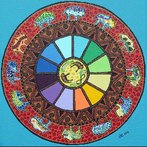 Extended Label Info: This painting was originally created to support Métis cultural resource development with the Métis Nation of British Columbia. It celebrates the role of the bison in the development of the Métis culture. During much of the nineteenth century, bison hunting was integral to the Métis’ social, economic, and political life. As “people of the buffalo,” the Métis were bison hunters par excellence. This painting is by artist Leah Dorion who uses symbolism to celebrate the role of bison in Métis culture. The wheel motif is based on the Red River cart, a historically important form of transport for Métis families, and often used for travel out to the bison hunting camps. The design incorporated in the rim of the cartwheel is based on the tepee, a tent-like dwelling that the Métis and other Indigenous peoples used for travel on the prairies. The circle around the wheel reflects the traditional plan of Metis encampments, which were set up in a large circle. Two baby bison in the centre of the wheel emphasize the important role children have in Métis society. Beside them, Dorion has painted the infinity symbol which is part of the Métis flag, and incorporated motifs from Métis floral beadwork designs. The green vines and stems represent eternal growth for the Métis Nation: past, present, and future. Twelve adult bison on the rim of the wheel represent the protective role of adults in the Métis community. Each of the adult bison are decorated with designs based on seasonal stories told through-out the year, teachings of Métis values and beliefs. Four of the bison have purple Métis infinity symbols on them and represent the Cardinal directions. The bison on the wheel are positioned to give the sense of movement, suggesting that the wheel is actively turning. Leah Dorion is also an author of several books, including “Métis Camp Circle: A Bison Way of Life” (2019) which transports young readers back in time when bison were the basis of Métis lifeways on the Plains. Leah Marie Dorion (1970 - ) is an Indigenous (Métis) artist, educator, storyteller and author. Born in Nipawin, Sk., she currently lives in Prince Albert, in Treaty Six Territory. Self-taught, Dorion credits her creative family for inspiring her to take up painting and the traditional Métis arts. The themes in Dorion’s work include Métis culture and history, spirituality, and the history and roles of women in Métis and Indigenous culture. Dorion often combines contemporary materials and art styles with traditional Métis symbols and beadwork motifs. Dorion’s artwork has been exhibited regionally and is held in private and public collections. Her publications include: “The Giving Tree: A Métis Story about Giving and Receiving” (2009).