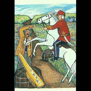 Extended Label Info: This series of paintings was created by Sherry Farrell Racette for the book “Stories of the Road Allowance People” to accompany oral tales from Métis elders, translated from Nêhiyawak/Cree-Michif to English by author Maria Campbell. The road allowance refers to Crown land which had been reserved for public use and was therefore un-occupied by settlers. After the battle of Batoche, many Métis people lost their land to Canadian authorities and were reduced to occupying the “road allowances”, areas of land designated for roads by Crown surveyors. Campbell’s poignant retelling of Métis traditional stories handed down from lii vyeu—the Old People, has become a treasured resource about the traditional Michif worldview. Dr. Sherry Farrell Racette (1952- ) was born in Pine Falls, Manitoba of Métis heritage, and is a member of the Timiskaming First Nation (Quebec). She has earned a BFA (1974) and a certificate in Education (1975) from the University of Manitoba; a MEd (1988) from the University of Regina, and a PhD from the University of Manitoba in the Interdisciplinary Program in Anthropology, History and Native Studies (2004). Her beadwork, painting, and multi-media textile works reflect her research in First Nations and Métis history, traditional arts, gender studies, and issues of self-representation. Her work has been exhibited nationally and is held in numerous public collections including the Canada Council Art Bank, Saskatchewan Arts Board, and MacKenzie Art Gallery. Maria Campbell (1940- ) is an Elder, educator, author, playwright, broadcaster, and filmmaker of Métis heritage. She was born on a trap-line in rural Saskatchewan and grew up in a road-allowance community. Fluent in four languages: Nêhiyawak (Cree), Michif, Anihšināpēk (Saulteaux) and English, she is currently the Elder in Residence at the Centre for World Indigenous Knowledge and Research at Athabasca University. Campbell’s ground-breaking autobiography, “Halfbreed” is one of the most widely taught texts in Canadian literature. She earned an M.A. in Native studies from the University of Saskatchewan, and taught creative writing, Native studies, and drama for many years. A member of the Saskatchewan Theatre Hall of Fame, Campbell’s awards include the National Aboriginal Achievement Award, the Gabriel Dumont Order of Merit, and the Order of Canada (2008).