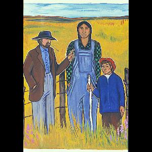 Extended Label Info: This series of paintings was created by Sherry Farrell Racette for the book “Stories of the Road Allowance People” to accompany oral tales from Métis elders, translated from Nêhiyawak/Cree-Michif to English by author Maria Campbell. The road allowance refers to Crown land which had been reserved for public use and was therefore un-occupied by settlers. After the battle of Batoche, many Métis people lost their land to Canadian authorities and were reduced to occupying the “road allowances”, areas of land designated for roads by Crown surveyors. Campbell’s poignant retelling of Métis traditional stories handed down from lii vyeu—the Old People, has become a treasured resource about the traditional Michif worldview. Dr. Sherry Farrell Racette (1952- ) was born in Pine Falls, Manitoba of Métis heritage, and is a member of the Timiskaming First Nation (Quebec). She has earned a BFA (1974) and a certificate in Education (1975) from the University of Manitoba; a MEd (1988) from the University of Regina, and a PhD from the University of Manitoba in the Interdisciplinary Program in Anthropology, History and Native Studies (2004). Her beadwork, painting, and multi-media textile works reflect her research in First Nations and Métis history, traditional arts, gender studies, and issues of self-representation. Her work has been exhibited nationally and is held in numerous public collections including the Canada Council Art Bank, Saskatchewan Arts Board, and MacKenzie Art Gallery. Maria Campbell (1940- ) is an Elder, educator, author, playwright, broadcaster, and filmmaker of Métis heritage. She was born on a trap-line in rural Saskatchewan and grew up in a road-allowance community. Fluent in four languages: Nêhiyawak (Cree), Michif, Anihšināpēk (Saulteaux) and English, she is currently the Elder in Residence at the Centre for World Indigenous Knowledge and Research at Athabasca University. Campbell’s ground-breaking autobiography, “Halfbreed” is one of the most widely taught texts in Canadian literature. She earned an M.A. in Native studies from the University of Saskatchewan, and taught creative writing, Native studies, and drama for many years. A member of the Saskatchewan Theatre Hall of Fame, Campbell’s awards include the National Aboriginal Achievement Award, the Gabriel Dumont Order of Merit, and the Order of Canada (2008).