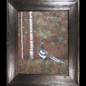 Extended Label Info: A magpie at the bottom of the tree looks up, directing our eyes to a phrase in cursive script. The words, “perspective, shat upon”, are a combination of image and salty language that suggests a visual joke or bar-room fable. This painting is part of a series, “Live as Birds”, a set of smaller works included in an exhibition with large-scale narrative paintings which toured nationally in 1992-93. Entitled ironically as “Tales of Dominion”, the exhibition took a critical look at how Canadian identity has been constructed through retelling historical events. The word “Dominion” here references the process of colonization, and alludes to an old name for our country, “The Dominion of Canada” which signified our status as a territory under the control of the British government. McConnell’s visual allusions and puns may invite us to laugh, but also to rethink the events that we think of as foundational to our national values. McConnell is also deeply inspired by art history, and though these works are densely painted on rough plywood, his compositions and colour choices often refer to earlier historical works or book illustrations, such as Aesop’s fables. Grant McConnell (1958 - ) was born in Ontario, and studied at Mount Allison University in Sackville, NB (1978-1980) before moving to Saskatoon, for his BFA (1983) and MFA (1994) from the University of Saskatchewan. In addition to painting and curation, McDonnell is a strong leader in the local arts community. His work has been exhibited internationally, and is held in numerous private and public collections, including the Saskatchewan Arts Board, Mendel Art Gallery, MacKenzie Art Gallery, Regina Public Library, and SaskTel.