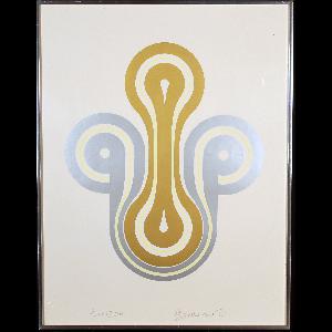 Extended Label Info: French Canadian architect François Dallegret’s work often blurs the line between art and design. His vision was shaped by the radical architecture and design movement of the late 1960s, as typified by the work of the experimental French artist, Yves Klein and the architectural firm, Superstudio. Dallegret is interested in how technology can improve our everyday lives, and he is known for combining a clean, architectural style with elements of humour. In this lithographic print, Dallegret’s use of metallic inks and sleek, symmetrical forms create a mechanical and futuristic look. While the subject of this print appears to be quite abstract, the title “Gono” is a prefix used in biology, meaning “sexual” or “reproductive” which suggests that the shape of Dallegret’s design is based on reproductive organs. François Dallegret (1937- ) was born in Morocco. His father was an architect with the Trans-Sahara railroad. After WWII, his family moved to France. Dallegret studied architecture at the Ecole Nationale Supérieure des Beaux-Arts de Paris from 1958-63. He was eager to leave France and moved to New York for nine months before settling in Montreal, where his career in design and architecture flourished. Dallegret has contributed to several significant projects, including Expo 67, a “world exhibition” held in Montreal for Canada’s 100th birthday. In the 1960s, he designed two architecturally ground-breaking club spaces in downtown Montreal, “Le Drug” and the “New Penelope”. His artwork has exhibited internationally, including at a major retrospective at the Musée du Québec (1999), the Centre Pompidou in Paris (2001), the Musée des Beaux-Arts in Montreal (2003), and the Mudam in Luxembourg (2007).