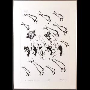 Extended Label Info: Though Sarain Stump lived in Saskatchewan only a short time, his influence as a teacher and activist is remembered by a generation of Indigenous artists, including Gerald McMaster and Edward Poitras. To create this print of a drawing, Stump used a historic method known as lithography. Printers ink is applied to an image on a flat printing surface, a litho stone or plate. The ink only sticks to the grease of the drawing. Then paper is placed onto the plate, and using pressure, usually in a printing press, the image transfers to the paper. Stump’s drawings and poems were inspired by Indigenous stories, and his own experiences. Sarain Stump (1945 – 1974), Born Mario Sarain in Venice, Italy, Stump was a writer, musician, actor and educator who was inspired by Indigenous culture. Later in life, in recognition for his activism and teaching, he was adopted into the Plains Cree Nation. As a young man, he studied draftsmanship and design at a Venice technical institute. His interest in North American Indigenous history, art and culture inspired him to change his name and move to Canada, taking a job at an Alberta ranch in the early 60s. In 1969, Stump published a book of poems and drawings, “There is My People Sleeping” which inspired many Indigenous artists and writers. Joining the staff at the Saskatchewan Indian Cultural College in 1972, Stump became the art coordinator and travelled throughout Saskatchewan, visiting First Nations communities and talking with students about Indigenous art. He also married a Métis woman, Linda Youens (now Jaine) with whom he had a son, and travelled the Americas, studying Meso-American Indigenous cultures. Tragically, he died quite young in 1974, in a drowning accident off the coast of Mexico.