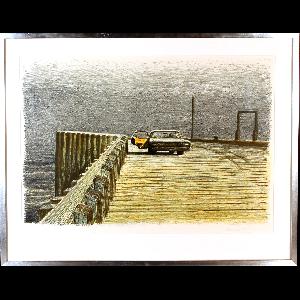 Extended Label Info: On an empty pier at night, a car and driver wait. The passenger door is swung open. It is a mysterious scene which invites our speculation—who is waiting? Why? Entitled “Ebb-tide and Waiting” this lithographic image was drawn and hand-printed by the Nova Scotian artist Tom Forrestall. His approach to composition infuses a highly realistic, almost mundane subject matter, a waiting car, with a dream-like sense of story. This technique is very similar to the work of several other painters in the Maritimes: Alex Colville, Christopher Pratt, and the photo-realist Mary Pratt. Known as “Atlantic Realism”, their work depicts everyday life and the Maritime landscape through a poetic lens. Thomas (Tom) DeVany Forrestall C.M., O.N.S., B.F.A. LL.D., RCA (1936—) is one of the leading figures associated with the visual arts of the Maritime region. He was born in Middleton, Nova Scotia. Growing up in Dartmouth, he crossed the bridge to Halifax each Saturday morning to attend art classes at the Nova Scotia College of Art (now NSCAD University). In 1954, Forrestall was awarded a scholarship to Mount Allison University in Sackville, New Brunswick, where he studied under Lawren P. Harris and Alex Colville. He earned his BFA in 1958, and with funding from one of the first Canada Council grants for independent study, travelled Europe. Returning, Forrestall worked as an assistant curator at the Beaverbrook Art Gallery in Fredericton (1959) but became a full-time painter the following year. In addition to his studio practice, he worked as an editorial cartoonist for the Fredericton Daily Gleaner, and as a designer at UNB Press. Forrestall’s work has exhibited internationally and is held in numerous private and public collections. His work is featured in the book “High Realism in Canada” (Paul Duval, 1974), and in two monographs, “Shaped by This Land” (1974) and “Returning the Favour: Vision For Vision” (1992).