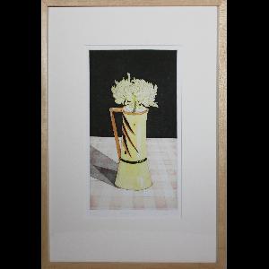 Extended Label Info: Don McVeigh is known for his strong compositions and precise realism. Working almost exclusively in watercolour and printmaking, his imagery explores visual problems in pattern and geometric balance using arrangements of flowers and vessels, cloth, string, dried fish, bamboo and other natural materials. This artwork, “Yellow Jug” is an artist-made print, an aquatint etching hand-coloured with watercolour paint. The still-life composition featuring a blossom in a ceramic vase is part of a series of floral studies that McVeigh created in the early 1980s in homage to the beauty of humble objects. The flower, a “chrysanthemum creamist white” or football mum, has hints of yellow that are picked up by the yellow of the ceramic pitcher. Though the checkered tablecloth, once a cheery red and white, is now faded in this print, the scene is still dramatic: strong shadows suggest an artificial spotlight, highlighting the arrangement against the featureless, theatrical backdrop. Don McVeigh (1951- ) was born in Edmonton, Alberta. McVeigh studied printmaking at the University of Alberta in Edmonton, earning his BFA with Distinction in 1973. After travelling in Holland during 1975, McVeigh moved to Saskatchewan. He earned his MFA at the University of Regina in 1978, and then moved to Saskatoon. In 1985, McVeigh moved to Ottawa, where he taught drawing at the Ottawa School of Art for many years. McVeigh's artworks have been exhibited across Canada since the early 1970s and are held in numerous private and public collections including the Canada Council Art Bank and JR Shaw Centre for Arts & Culture (formerly Glenbow Museum).