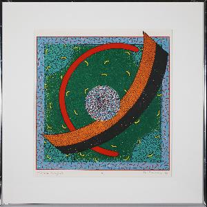 Extended Label Info: Mary Shannon Will was a long-time member of the Calgary arts community, known for her sensuous ceramic sculpture and vibrant abstract painting. She used bright colours and created elaborate surface textures by layering pointillist dots and dashes. This artwork is part of a series of prints that she began in the 1980s using a subjective system of rules and chance to guide her use of colour and pattern. Her interest in conceptualism and the development of this system began with a summer spent at the Nova Scotia College of Art and Design, and research into the work of John Cage. Her first body of work created in this way was a series of abstract geometric ceramic sculptures (1978–1985). To create their glowing, glazed surfaces Will built up layers of solid and graduated colour, precisely patterned with hundreds, sometimes thousands, of tiny dots and dashes. Though inspired by conceptual systems, she never allowed them to override her personal responses to the process or materials: “Beauty was her endgame.” (Alberta Foundation for the Arts) Mary Shannon Will (1944-2021) born in Sampson, New York in 1944. Her childhood was spent in Seattle, Washington. Her family then moved to Madison, Wisconsin, where she completed high school. After a year at Coe College, a liberal arts college in Cedar Rapids, Iowa, she studied ceramics at the University of Iowa (1964–1967), the Tuscarora Pottery Summer School (1966–1967), and the University of New Mexico in Albuquerque (1970–1971). In 1971, Mary and her husband (also an artist) moved to Calgary, where he taught at the university, and she set up her ceramics and painting studios. Over her long career, Mary Shannon Will took annual trips to New Mexico, splitting her time Calgary and Albuquerque. She taught at Emily Carr College of Art & Design, in Vancouver, B.C., and at Tuscarora Pottery in Tuscarora, Nevada. Her works are held in numerous private and public collections, including the Alberta Foundation for the Arts, Canada Council Art Bank, Edmonton Art Gallery, Glenbow, and the University collections of Calgary, Lethbridge, and Alberta.