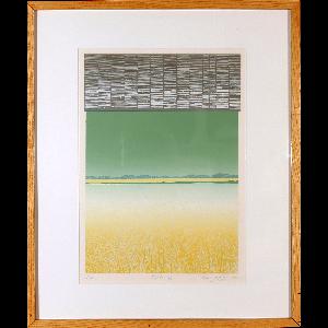 Extended Label Info: Throughout her extensive career as a printmaker, Ann McCall has explored themes of landscape, researching new ways to visually represent the land and our relationship with nature. In this lithographic print, Fields VI, McCall depicts the view from a window, a dynamic composition of grain fields in a forced perspective from extreme closeup to distant horizon. The image is “framed” by a window casing and woven bamboo blinds, which situate us as viewers inside a room looking out over the field. Although this dynamic suggests a contrast between the interior and the outdoors, and the viewer and the land, the colours McCall has chosen are harmonious and unite the scene. The grey used for the blinds is a pastel tone, as are the calming green and harvest yellow in the landscape. Ann McCall RCA (1941 - ) was born in Toronto, Ontario. McCall earned her BA in Art History at McGill University in Montreal (1964). Moving to Pennsylvania in the USA, McCall studied art production at the University of Pittsburgh (1971-74). She returned to Montreal in the mid-1970s and studied at the Université Concordia, earning her BFA in printmaking (1978). After graduation, McCall established her studio in Montreal, Quebec where she has worked as a printmaker, calligrapher, and mixed media artist. McCall was elected to the Royal Canadian Academy of Arts in 1982, serving as president from 2010-2012. McCall is also a member of Atelier Circulaire, an artist-run centre in Montreal dedicated to printmaking which offers training, access to equipment, and exhibition space. Since 1977, McCall has exhibited her work in over 65 solo exhibitions in Canada, the US and Australia, and has participated in over 250 international group print exhibitions. Her artwork is held in numerous public, corporate, and private collections.