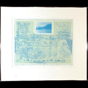 Extended Label Info: This artwork by Christopher Finn, entitled “Bluesy” is a silkscreen print on paper. This work was produced at the Grand Western Canadian Screen Shop in Winnipeg, an artist-run press that operated from 1968-1987 and facilitated experimental printmaking in the prairies. This image is made up of three components: a post-card sized photo of a mountain landscape inset into a more abstract texture, and surrounding this entire image, a border of tiny stars. Looking closely at the artwork, we can see that the inset postcard is made up of circles of dots, a “photomechanical duotone” technique. The mountains and lake in the photograph look like the Rocky Mountains near Banff, Alberta. The second part of the image, the abstract texture, consists of indistinct blue circles and lines, overprinted in green ink with a fine grid that resembles graph paper. Under the grid, the blue abstract shapes appear quite watery. The entire composition, with the post-card of mountains and a lake floating atop of the abstract area, suggests an imagined view into the depths of the water. Painter, printmaker, and independent curator, Christopher J. Finn (1950 - ) was born in Windsor, Ontario, where he earned his BFA in painting and printmaking at University of Windsor (1972). Moving to Saskatchewan, Finn earned his MFA in printmaking at University of Regina (1973-75). During this time, he attended the Emma Lake Workshops, studying with master lithographer Robert Eagerton (1974). In addition to his studio practice as an artist, Finn worked as a screen-printer with such studios as Grand Western Screen Shop in Manitoba. After attending the Banff Centre School of Management, Finn earned certification in Museum and Art Gallery Management (1985), a Certificate in Architectural Drafting at Red River College (1986), and his B.Ed in Art/History (1989) from the University of Manitoba. His curatorial work includes Assistant Curator at the McMichael Canadian Art Collection (2002-2016) and Curator of Education at the Art Gallery of Windsor (2017-2020). Finn’s work is held in numerous private and public collections, including Remai Modern (Saskatoon), Museum London (London, Ontario), Winnipeg Art Gallery (Winnipeg), Banff School of Fine Arts (Banff), Canada Council Art Bank (Ottawa), and Toronto-Dominion Bank Collection (Toronto).